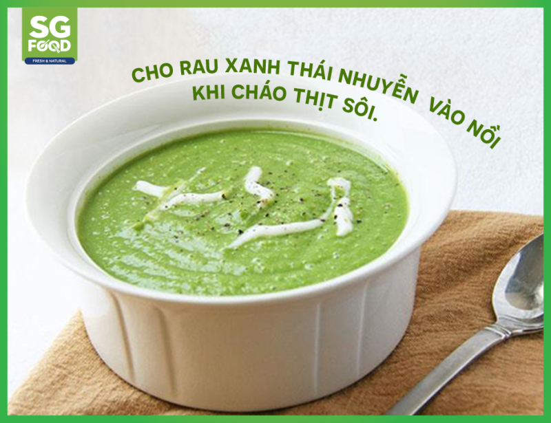 Muốn cháo được thơm ngon, nàng thái nhuyễn rau xanh (tần ô, cải ngọt, bó xôi, rau muống…) rồi cho vào cháo khi thịt đã chín. Đừng quên cho một muỗng dầu ăn vào cháo sau khi tắt bếp nàng nhé!